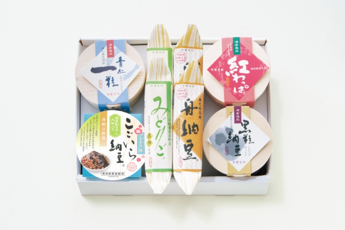 舟納豆2本/みどりご2本/青仁一粒1個/紅わっぱ1個/黒粒納豆1個/こごいら納豆梅アカモク味1個