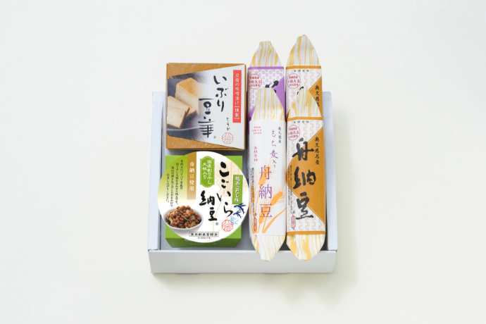 舟納豆2本/もち麦入り舟納豆1本/そばの実入り舟納豆1本/こごいら納豆焼あごだし1個/いぶり豆華1個