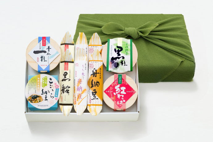 舟納豆2本/もち麦入り舟納豆2本/黒船2本/青仁一粒1個/紅わっぱ1個/宇治抹茶黒粒1個/こごいら納豆梅アカモク味1個