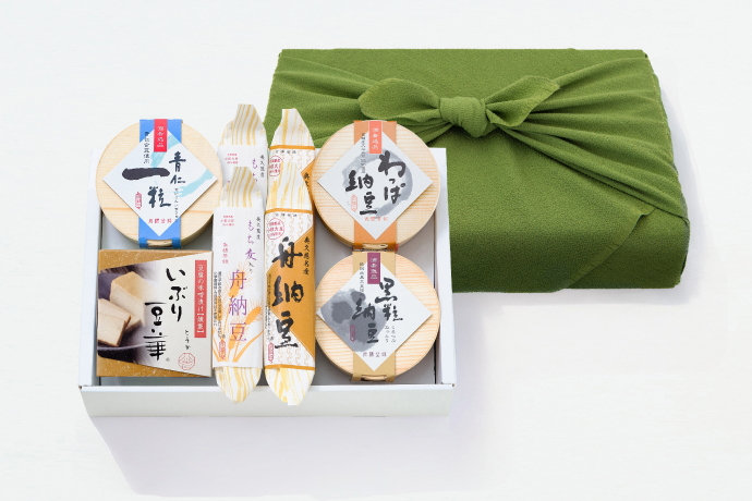 人気の舟納豆2種類に青仁一粒、わっぱ納豆、黒粒納豆、いぶり豆華を詰め合わせました。