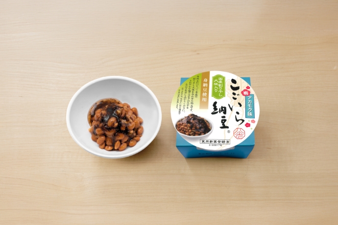 舟納豆に、干し大根・しょうが・昆布を合わせた味付け納豆「こごいら納豆」に特製の梅アカモクたれをかけてお召し上がりください。