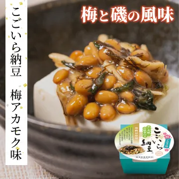 舟納豆に、干し大根・大根葉を合わせた味付け納豆「こごいら納豆」に特製の梅アカモクたれをかけてお召し上がりください。こごいら納豆と梅風味のアカモクのねばりが絡み合い、さわやかな風味をお楽しみいただけます。