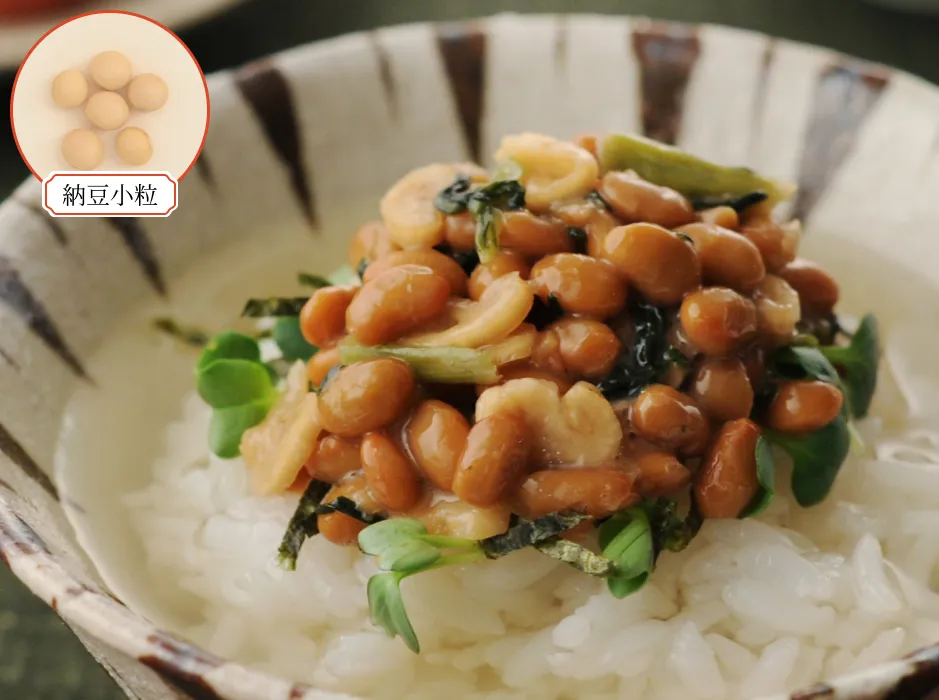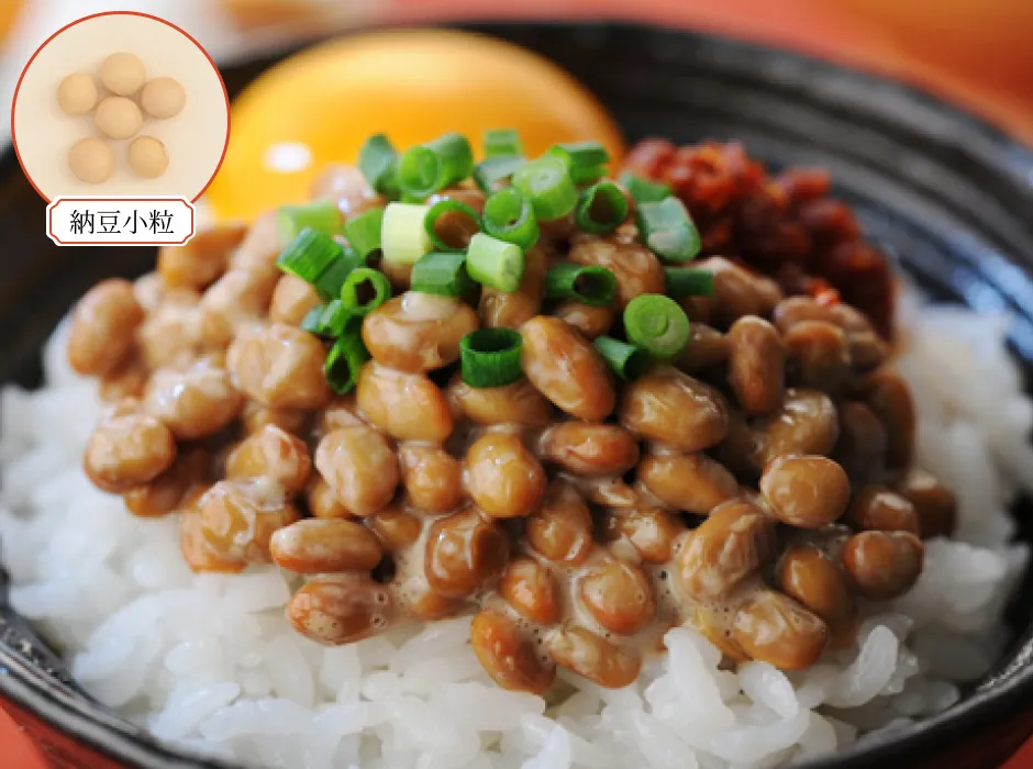 強い粘りと絡み合う小粒の納豆には、良質の大豆本来の味がしっかりといきています。
